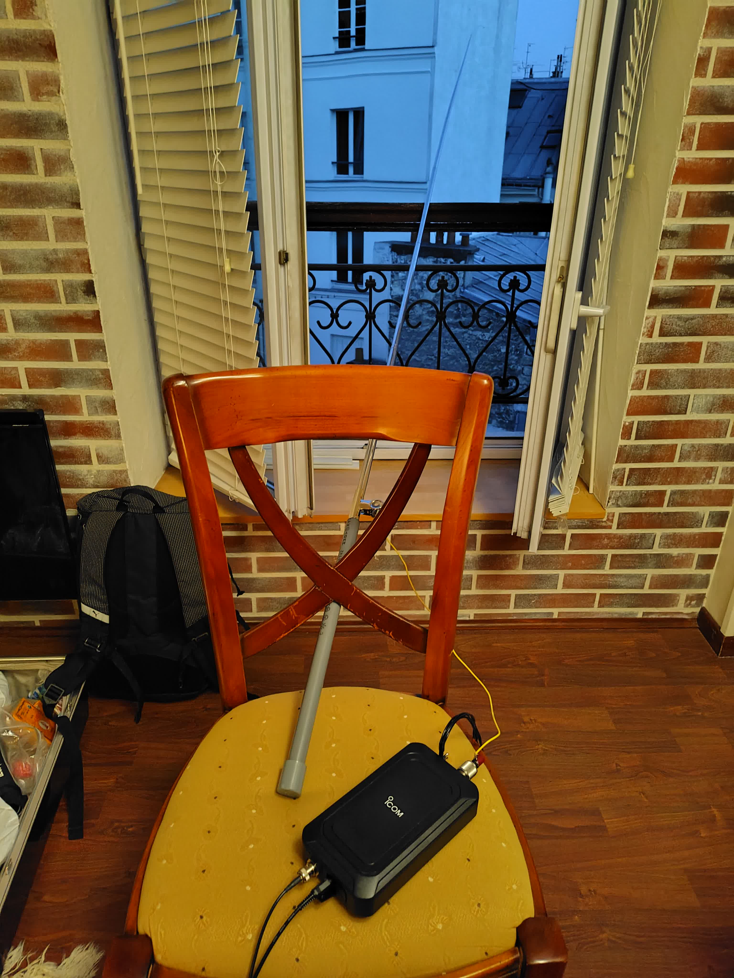画像を見ていただければわかりますが、アンテナは長いロッドアンテナです。これにIC-705用のオートアンテナチューナー(ATU)のAH-705を取り付けました。お世辞にもいい環境とは言えませんが、とりあえず運用はできます。