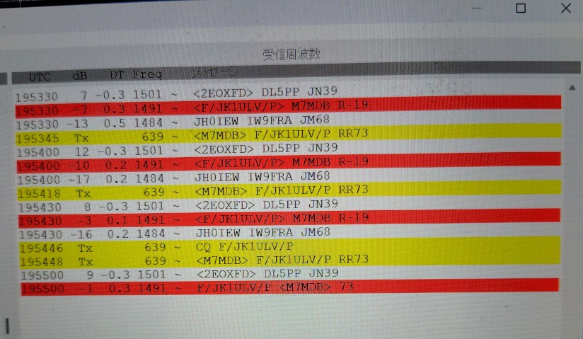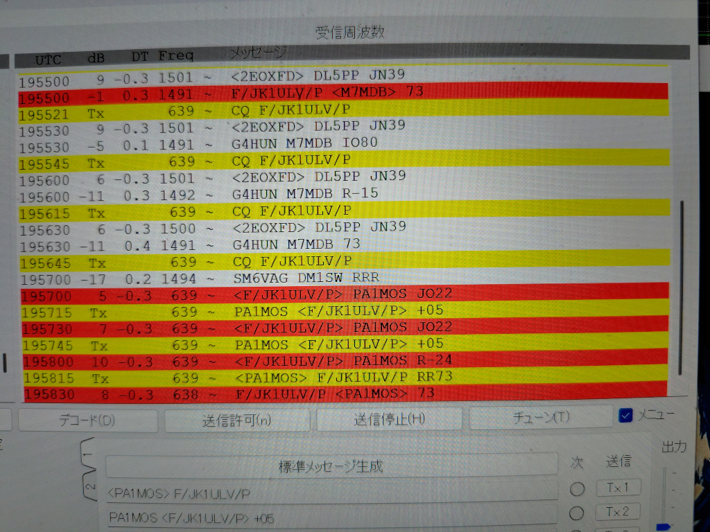実はFT8の運用は初めてだったのでJK1FUIに教えてもらいながら初QSOしました。画像ではイギリスのM7MDB局と交信しています。