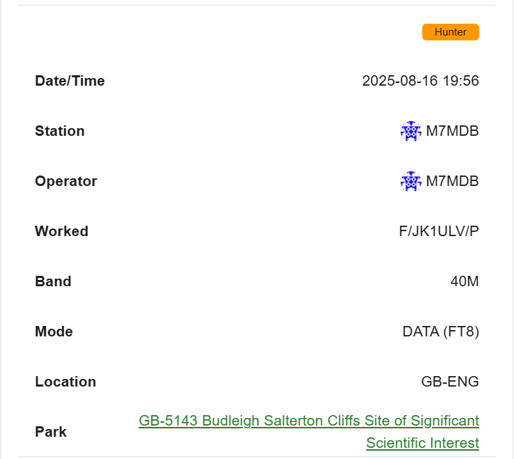 最初に交信したM7MDBはPOTA2のアクティベート中だったらしく、後でPOTAのハンターログを見たところ、画像のように記録されていました。