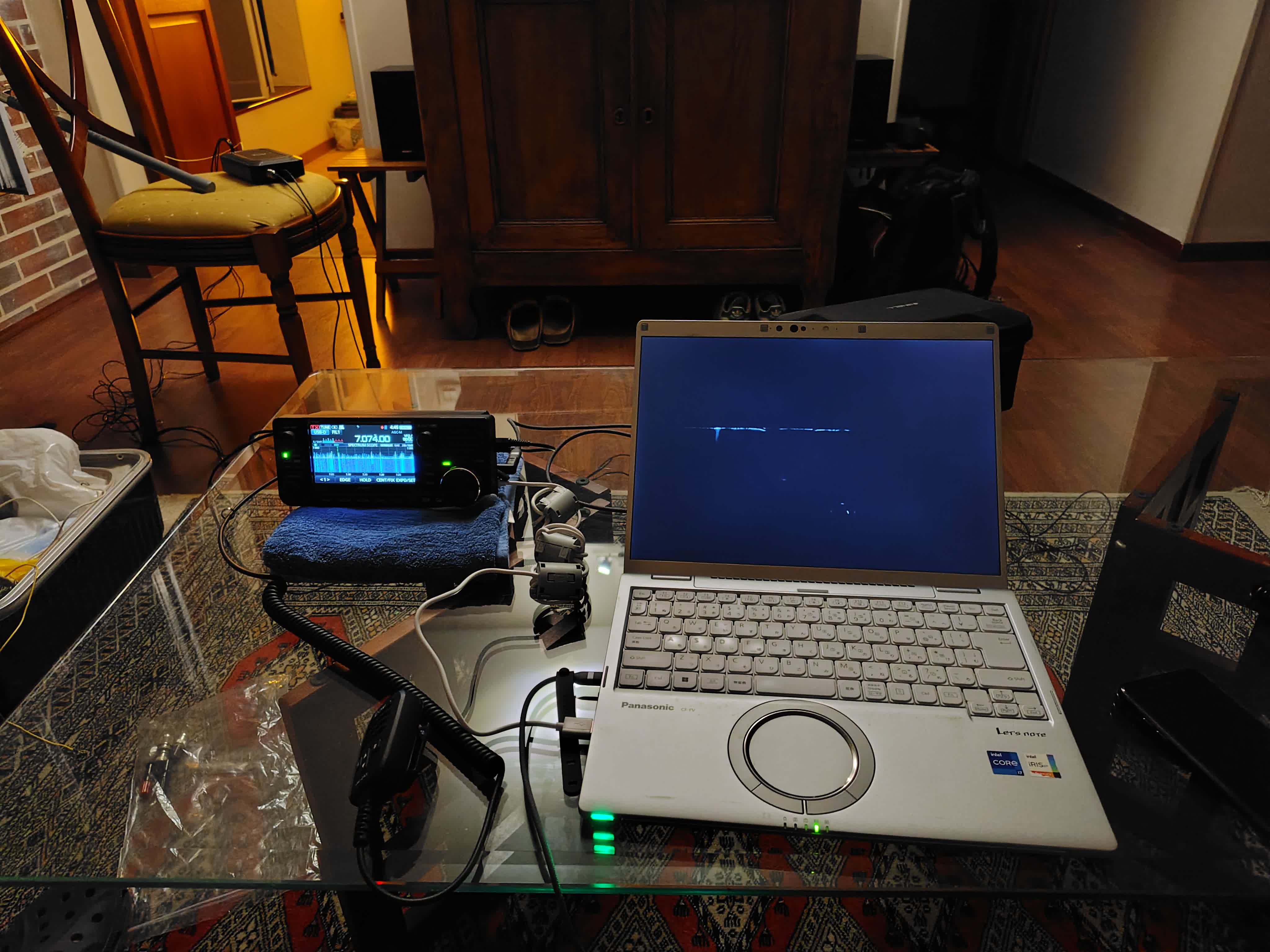 無線機はIC-705。出力は10W(外部電源使用)です。隣には液晶が壊れかけているコンピュータ。